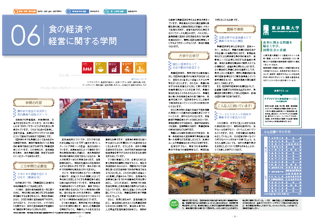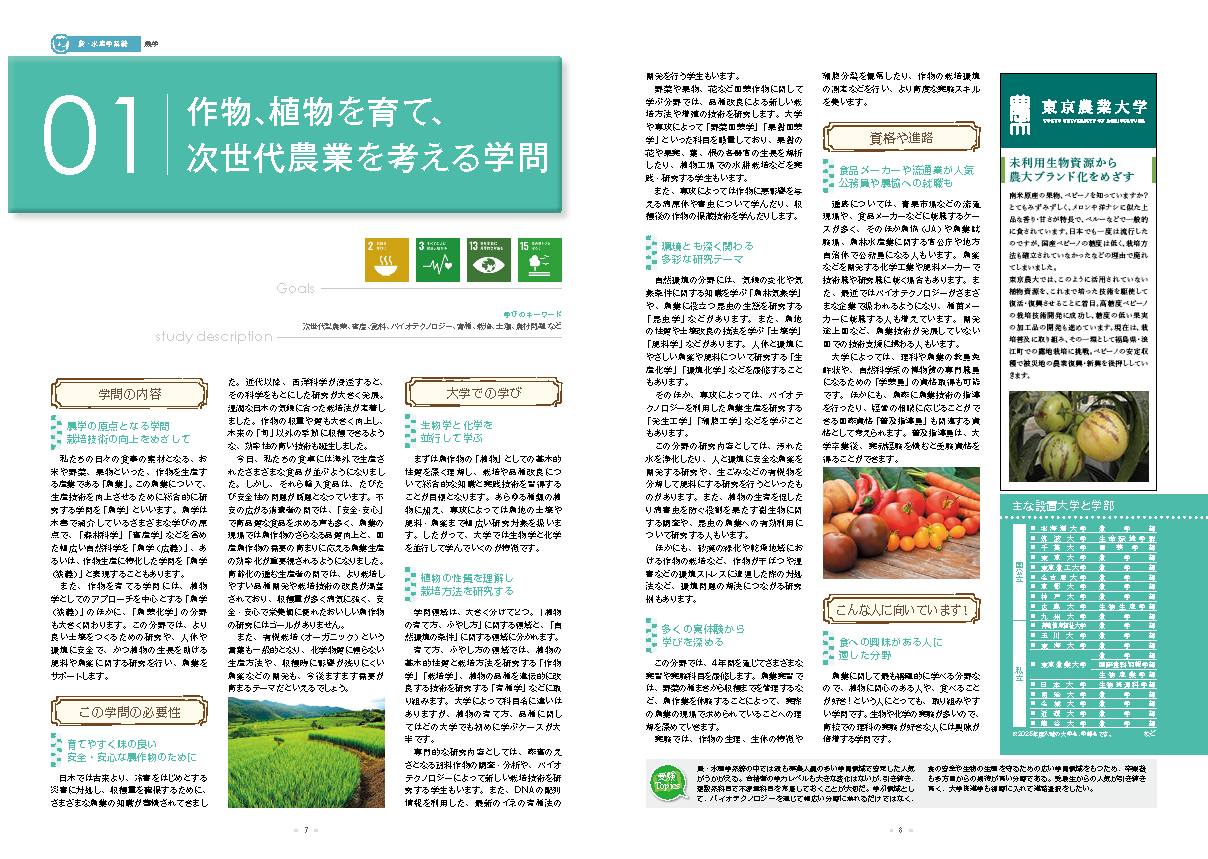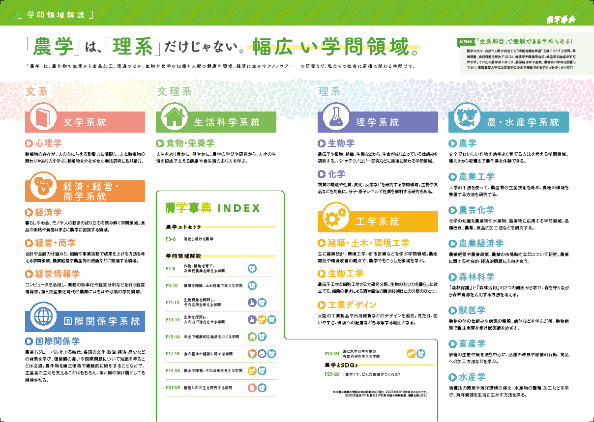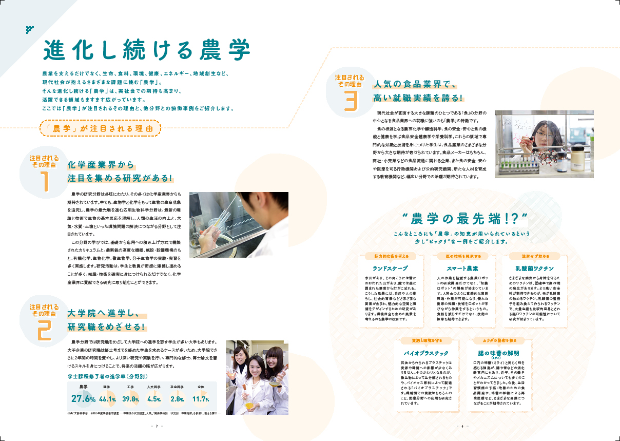 「農学」は「理系」だけじゃない!幅広い学問領域。「農学」は、農作物の生産から食品加工、流通のほか、生物や化学の知識を人間の健康や環境、経済に生かすテクノロジー の研究まで、私たちの社会に密接に関わる学問です。