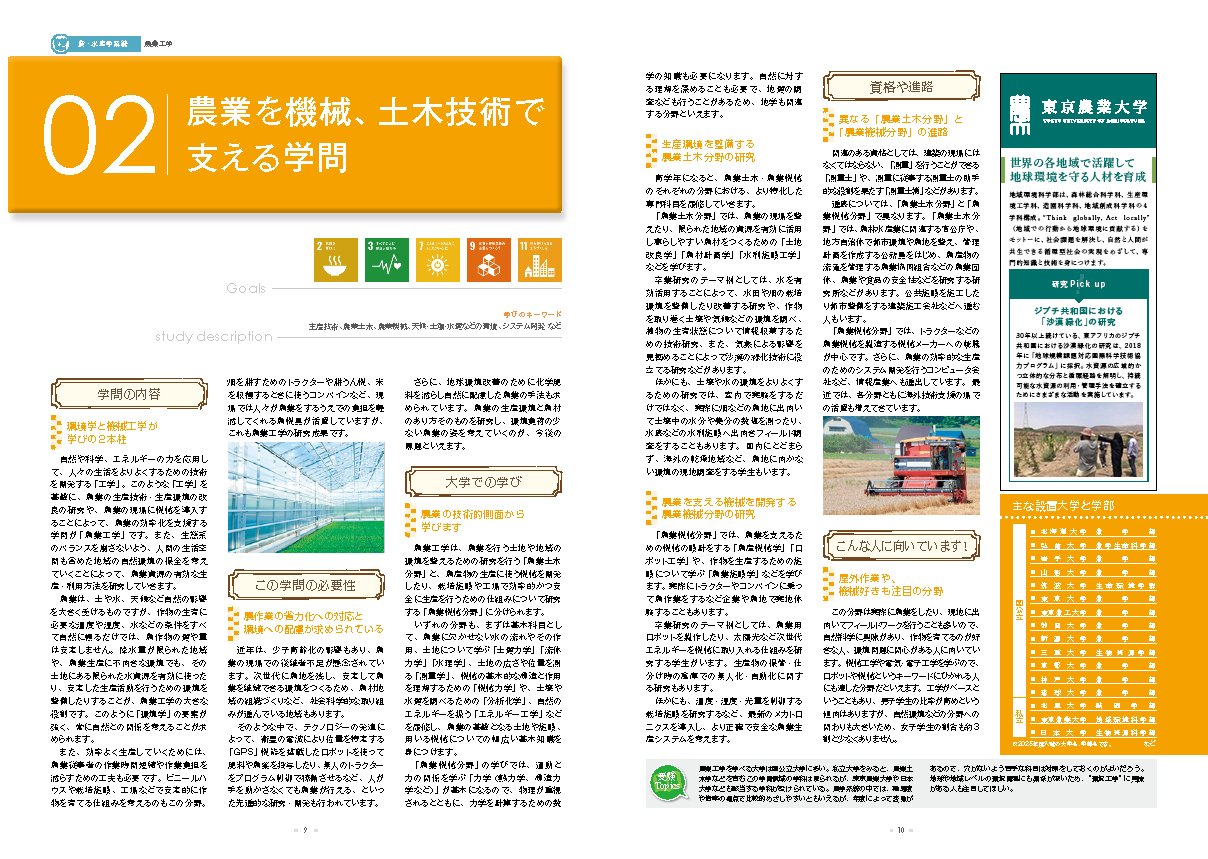 「工学」を基盤に、農業の生産技術・生産環境の改良の研究や、農業の現場に機械を導入することによって、農業の効率化を支援する「農業工学」という学問があります。