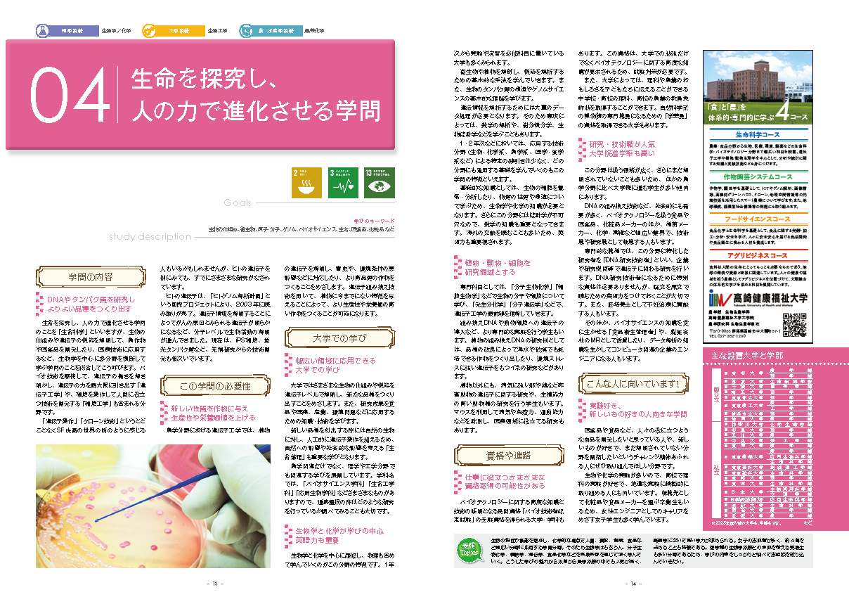 生物の仕組みや遺伝子の機能を解明して、農作物や医薬品を開発したり、医療技術に応用するなど、生物学を中心に多分野を横断して学ぶ学問のことを総合して「生命科学」と呼びます。バイオ技術を駆使して、遺伝子の働きを解き明かし、遺伝子の力を最大限に引き出す「遺伝子工学」や、細胞を操作して人間に役立つ技術を開発する「細胞工学」も含まれる分野です。