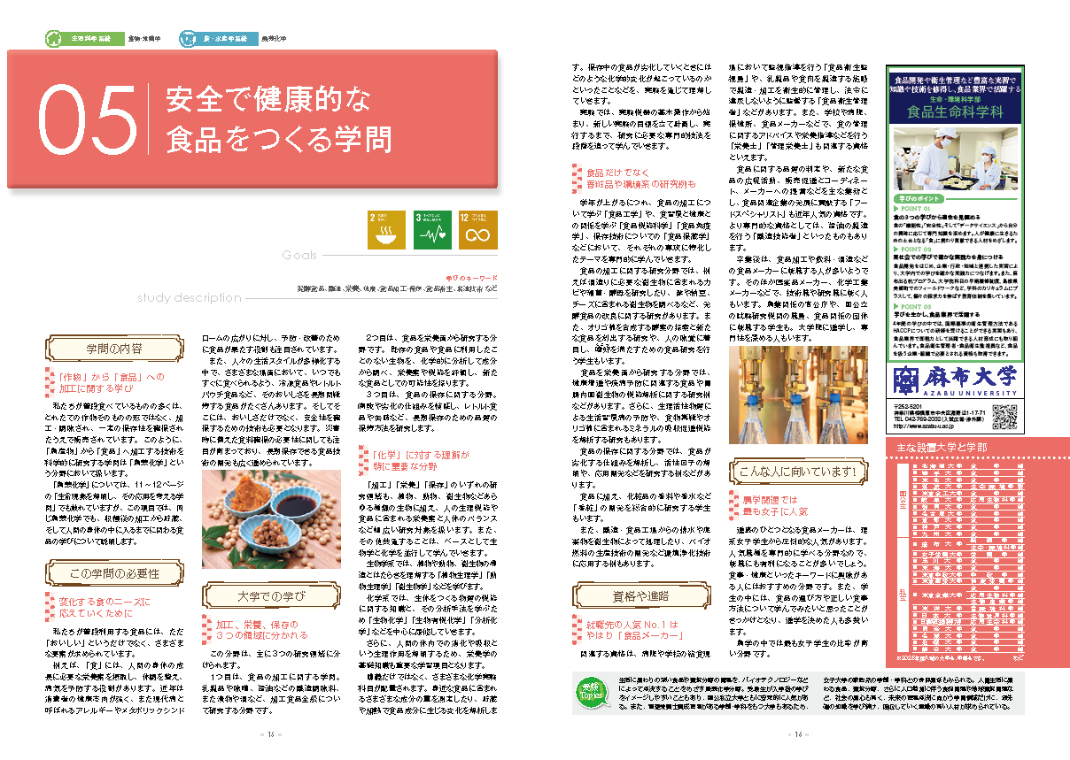 私たちが普段食べているものの多くは、加工・調味され、一定の保存性を確保されたうえで販売されています。収穫後の加工から貯蔵、人間の身体の中に入るまでの学びも「農芸化学」分野で扱います。
