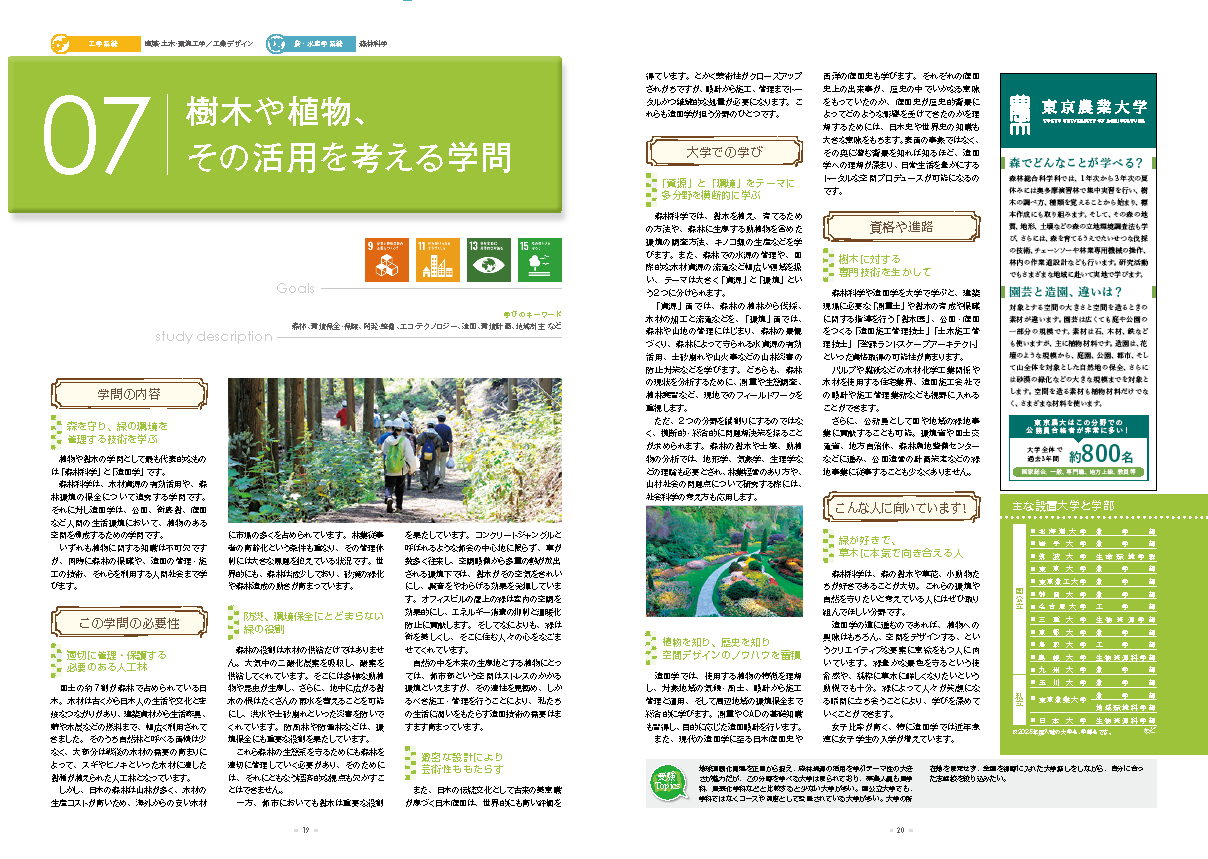 いずれも植物に関する知識は不可欠ですが、同時に森林の保護や、造園の管理・施工の技術、それらを利用する人間社会まで学びます。