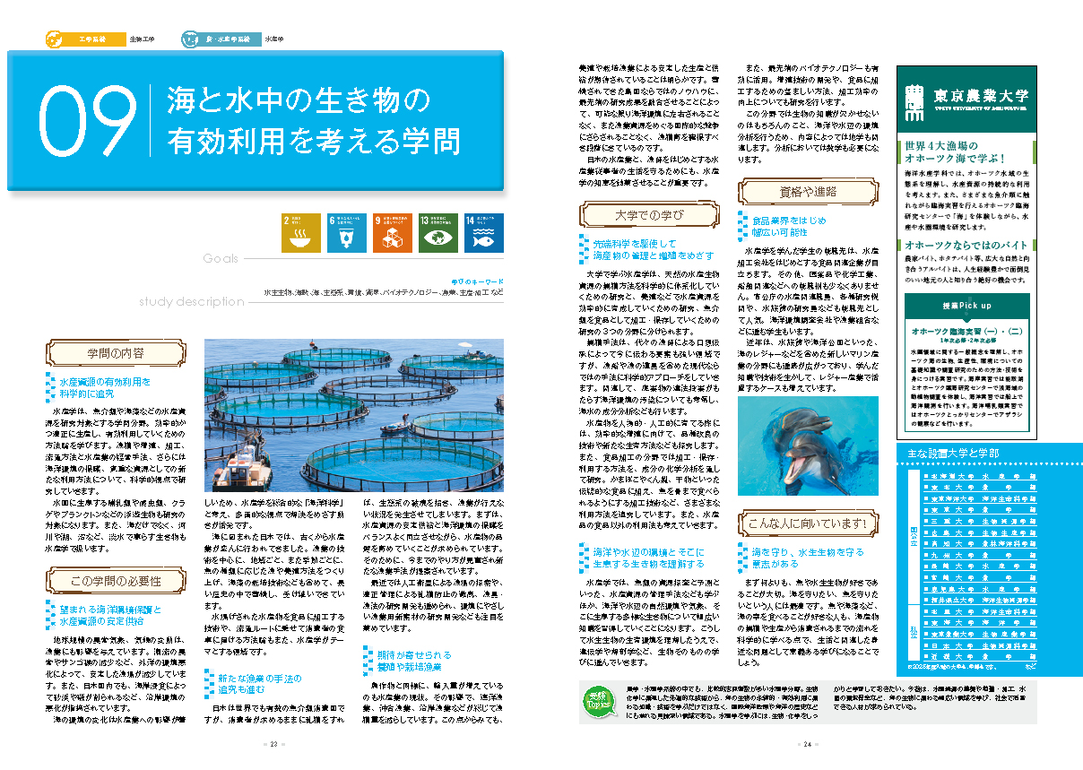 魚介類や海藻などの水産資源を研究対象とする学問分野の「水産学」。効率的かつ適正に生産し、有効利用していくための方法論を学びます。漁獲や増殖、加工、流通方法と水産業の経営手法、さらには海洋環境の保護、貴重な資源としての新たな利用方法について、科学的視点で研究していきます。