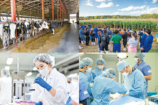 広大なキャンパスには、搾乳、肥育、栽培などの実務を経験できる3つの農業生産ステーション、原料受け入れから製造・出荷まで食に対する知識を体系的に学べる乳製品製造実験実習室や食品加工実習室、日本一の診療件数を誇る附属動物医療センターなどがあります。