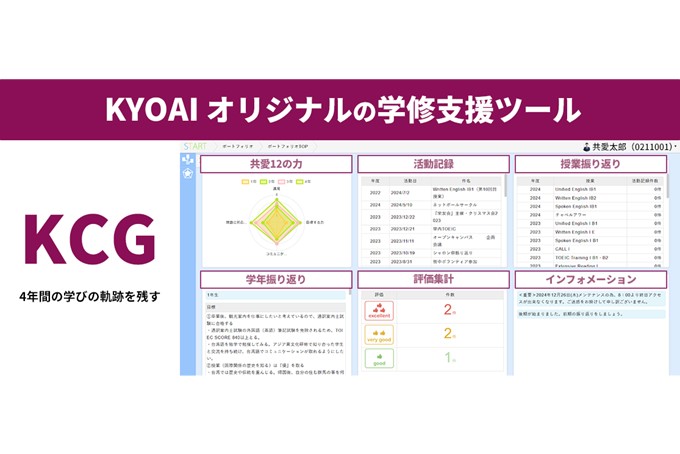 「KYOAI Career Gate」は、全学生がウェブ上にポートフォリオ(学修、スキル、実績を実証するための成果物を一か所に収集したもの)を持ち、4年間の自分の学びを残すためのシステムです。具体的には、ボランティア活動や海外留学などの学びの記録や授業内での学び・振り返り、資格取得の記録などを日々蓄積していく場所になります。これにより、自身の成長や学びの過程を振り返りやすくなり、就職活動や進学等で求められる自己分析も効果的にできるようになることが期待されます。