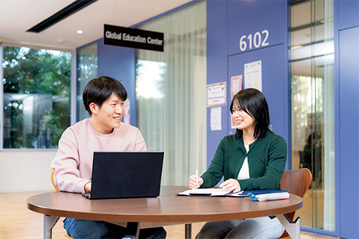 留学の経験をより充実したものにするため、留学前にしっかりと語学力向上に取り組みます。キャンパス内のグローバルラウンジでは、英語が身近に感じられる環境を整え、留学前後の語学力のブラッシュアップを行えます。