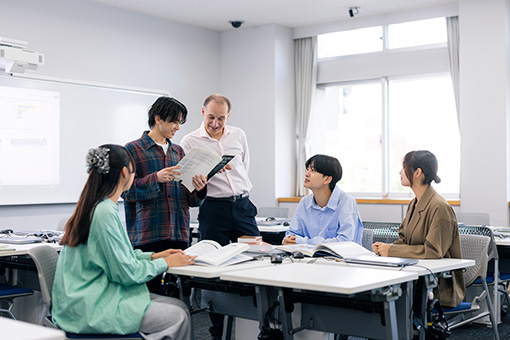 「Integrated English(IE)プログラム」は実践を通して、英語の4技能を習得する習熟度別コースです。グループ討論やプレゼンテーションを交え、文化や社会に関するトピックを勉強しながら、発音や文法への理解も深めます。豊富な専門知識を持つネイティブ・日本人教員が担当します。