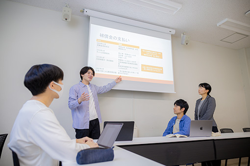 六法を中心に、現代社会で必要とされる法知識や技能を磨くことができる魅力的なカリキュラムを展開。企業法務、現代法実務論など法と実務とのかかわりを知ることのできる科目、刑事政策や国際刑事法、少年法などの先端・展開科目、法学ライティング(BasicとAdvanced)のように論述の力を磨ける科目も充実しています。学部専任教員が引率する海外セミナーも実施するなど恵まれた教育環境が整っています。