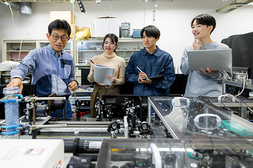 物理学はシンプルな根源原理を理解することによって、幅広い科学分野に応用できる学問です。本学科では基礎物理学をはじめ、固体、宇宙、生物といった対象が絞られた分野、さらには超伝導、ナノテクノロジーなどの最先端応用分野まで、さまざまな階層・スケールサイズの物理学をカバー。充実した設備環境での実験・演習形式の授業により、理解を深め実践力を高めます。