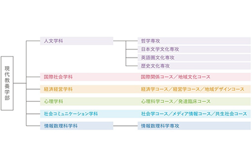 2025年度より、現代教養学部を6学科に再編しました。うち4学科では、分野の垣根を越えて学べるコース制を取り入れています。1・2年次は学科の基礎を学びながら、いろいろな分野に触れて視野を広げます。3年次には、自分の興味や将来の目標に合わせて、卒業研究につながる専門分野(コース)を選びます。入学後の学びや興味関心の変化を反映し、およそ2年間をかけて専門分野を決定することができます。