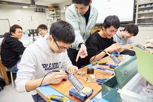 建学の精神である「実学尊重」は技術を学ぶだけでなく、実社会で役立てられることをめざすということです。このため本学では充実した実験・実習科目を設置し、他大学に先駆けて導入したものづくり体験授業「ワークショップ」など学生の創意工夫の力を育てる教育を数多く取り入れています。