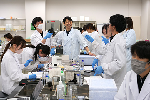 生命科学部では、「生命とは何か」という命の根源から、医学・薬学・農学・工学・理学まで幅広い分野を教育・研究し、生命科学の最前線で力を発揮できる人材を育成しています。1・2年次には化学・生物学といった生命科学の基礎から情報科学、研究者としての共通語である英語をしっかり学びます。また、1年次前期から実習にも重点を置き実験技術などを学びます。2年次後期からは専門科目が増え、3年次には講義と実習を通して専門分野を深め、4年次の1年間は研究室に所属して、これまでに習得した知識や技術に加え、教員の指導に従って実験を行い、最先端の研究を実践し、課題解決能力を養います。