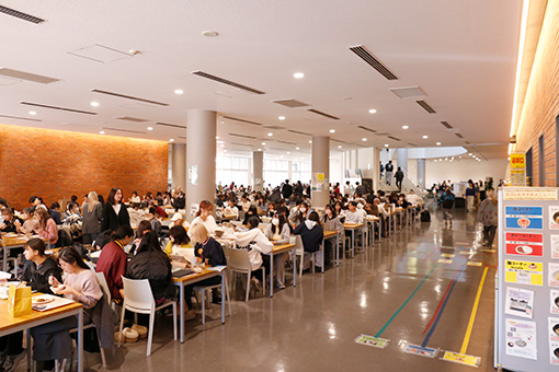 食堂と談話室を兼ね備えた学生会館は、くつろぎの場として多くの学生でにぎわいます。食堂は1階に700席と2階に500席で合計1200席あり、ゆったりと座ることのできるスペースとなっています。ほかにも談話スペースや自習スペースが備えられ、講義の合間や食事の時間をゆっくりと過ごすことができます。また、学生会館内は無線LANが導入されており、場所を選ばずインターネットに接続できます。