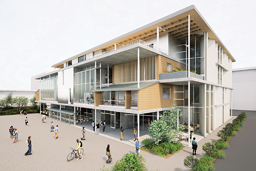 情報デザイン学部、メディア情報学部、情報理工学部の情報3学部を中心とした、プロジェクト型教育研究の高度化と交流のための施設が2027年春に完成します。多くの企業とも連携し、学部学科の垣根を越えて活動できるような、分野横断型の新たなプロジェクト拠点となります。