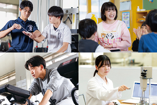 「健康」を軸として「こどもの成長」「栄養」「運動・スポーツ」を専門的に学ぶ4学科を設置。各学科ではそれぞれの専門的な知識を修得するのみならず、豊富な実学的科目(実験、実習、実技、演習など)を配置し、実践力を身につけるための特色ある教育を展開しています。