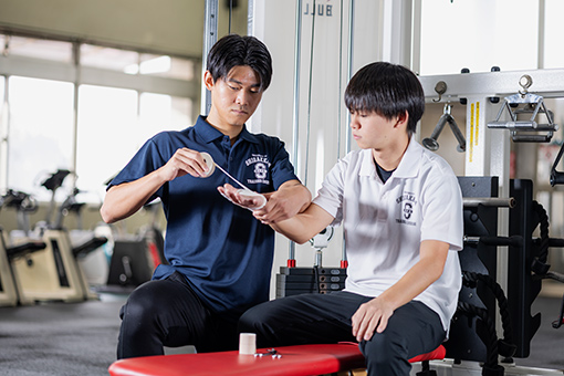 体育科学科では、トレーナーに関する専門知識と技能を修得しアスリートを支える「トレーナーコース」、アスリートとしての競技力向上や競技スポーツの指導者をめざす「競技スポーツコース」、中学校や高等学校における保健体育科教員としての専門知識と技能を有する「スポーツ教育コース」の3つのコースを設置しています。