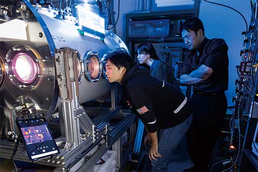 惑星探査機や人工衛星で利用が進んでいる電気推進機の研究用装置。宇宙環境を模擬した真空容器内でプラズマを生成・噴射して推力を得ます。