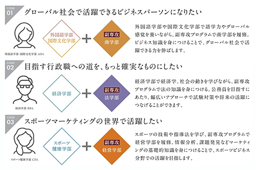 さらに、副専攻は将来の目標に合わせた組み合わせが可能です。たとえば、語学力を生かして国際ビジネス分野で活躍したい学生は「外国語学部+商学部の副専攻」、行政職をめざす学生は「経済学部+法学部の副専攻」、スポーツ分野でマーケティングに携わりたい学生は「スポーツ健康学部+経営学部の副専攻」といった形で、自分の進路に直結する学びを設計できます。
