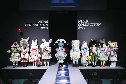 毎年学内で開催するファッションショー「NUAS COLLECTION」は、作品制作はもちろん、その企画から照明、音響、映像、美術、広報、モデルまで全てを学生が主体となって行います。協力しながら自分たちでショーをつくることで、困難を乗り越える力や協調性を養い、達成感が得られます。出展のチャンスは全学生にあり、1年次はグループ単位で制作を行い、2年次以降は学内審査を通過した作品だけが並ぶ実力勝負の場でもあります。