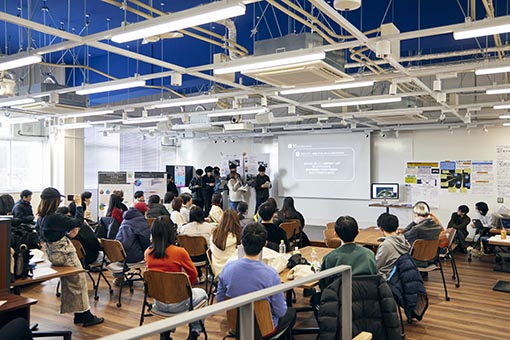 まずは「INNOVATIONラウンジ」へ。コーヒーを片手にソファでくつろげば、偶然隣り合わせた他学部の仲間と会話が弾みます。そこで生まれた小さなアイデアを、次は「INNOVATION HUB」で形にする。巨大スクリーンを背に、ピッチイベントで自分の思いや活動を社会に向けて「発信」し、共感する仲間を集めることができます。