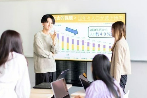経営学・マーケティング・会計学に加え、DXの手法を学び現代企業経営に対応。2年次からは4つコースに分かれ専門性を深めます。課題解決型学習や特色あるゼミ、独自のインターンシップを通じて実践力も養成。ビジネスに強い資格取得も可能です。