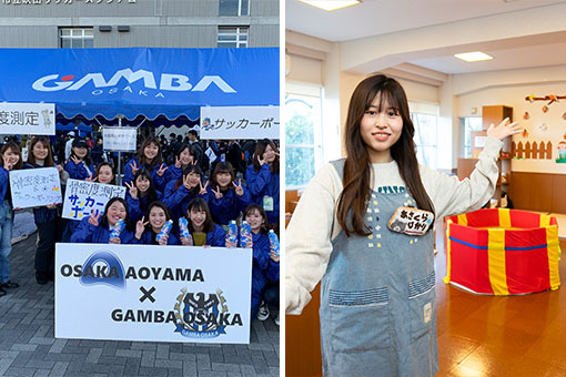 例えば、パートナーシップ契約を結ぶJリーグ・ガンバ大阪と連携して、「ガンバ大阪連携プロジェクト」でサービス・ラーニングを実践。ガンバ大阪の試合日にスタジアム前の特設ブースに出展し、不足しがちな野菜を手軽に採れるようにというコンセプトで開発したレトルトカレー「一日分の野菜 350g がちきんと採れるバターチキンカレー」(健康栄養学科)の販売などを実施しました。