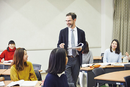 ビジネス英語にふれTOEIC(R)のスコアアップをめざす授業などもあり、就職活動や将来のキャリアに活かすことができます。さらに、入学時から高い英語能力を身につけている学生を対象にした特別選抜プログラム「English Honors Program」など、ハイレベルな特別クラスも編成しています。