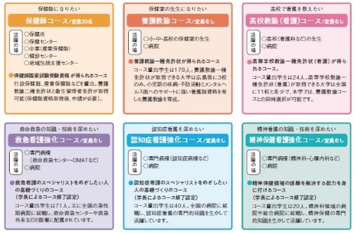 <保健師コース、養護教諭コース、高校教諭(看護)コース、救急看護強化コース、認知症看護強化コース、精神保健看護強化コース>