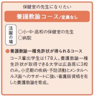 【養護教諭】◇広島県・広島市、高知県/2025年3月卒 ◇鹿児島県/2024年3月卒 ◇島根県/2023年3月卒 ◇熊野町(広島県)/2022年3月卒 ◇広島県・広島市、新潟市/2021年3月卒