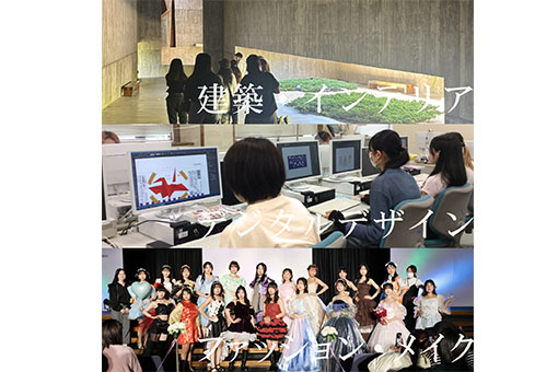 生活デザイン学科では、あなたの「デザインしたい!」という気持ちを大切に、建築・インテリア、デジタルデザイン、ファッション・メイクという3つのコースで、人々の生活を豊かにし、社会の課題を解決する力を身に付けます。座学だけでなく、作品を制作したり、企業や地域と協力して、実際に「もの」や「コト」を創り出したりする授業がたくさんあり、将来、あなたのアイデアで社会を動かす進路をめざせます。