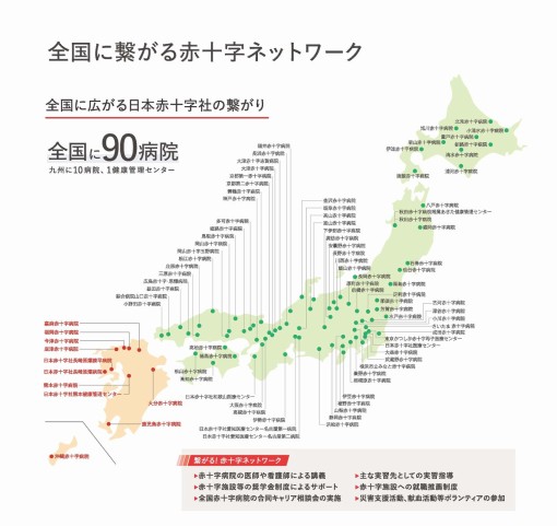 全国に広がる赤十字ネットワークが本学の最大の強みです。全国にある90の赤十字病院とつながりがあるため、福岡赤十字病院をはじめ、山口・熊本・唐津・嘉麻赤十字病院など、規模や機能の異なる施設での実習が可能です。