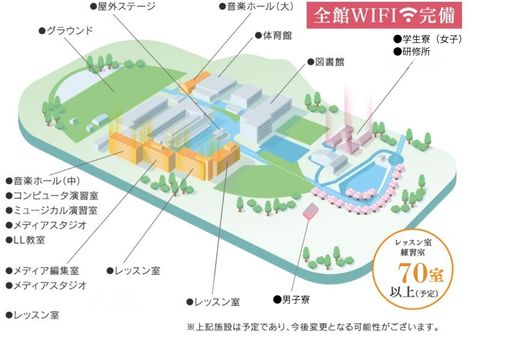 音の響きが豊かな音楽ホール、本格的なミュージカル練習室などを設置しており、ICT教育も行うことができる講義室、レッスン室、休憩室も数多く備え、音楽やICTを学ふ上で必要かつ最適な環境を提供します。