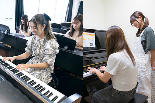 こども学科の専門教育をバックアップする施設と設備を整えています。こども学科の学生が使用する2階フロアには、電子ピアノ45台が設置された「音楽教室」があります。ここでは演奏時の注意点や教員の手の動きなどをリアルタイムに上部モニターで確認しながらレッスンができるため、ピアノ演奏の上達が飛躍的に早まります。さらに防音性に優れた「ピアノ個人レッスン室」があり、教員から個別レッスンを受けることができます。授業で使用しない時間は、学生が練習に利用することができます。