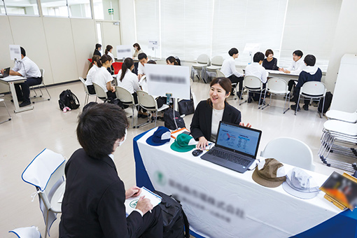 就職については1年次4月からキャリア支援プログラムがスタートします。早い時期に就職活動の始め方をレクチャーし、活動中には丁寧なカウンセリングを行う支援体制により、就職率は98.7%(2025年3月卒業生実績)と好調です。キャリアセンターでは教員・民間企業での人事実務経験者など専門スタッフが1年次から個別に学生一人ひとりをサポートします。2年次には全員参加の進路に関する「個人面談」を実施し、希望にあった求人の紹介、模擬面接などの個別指導、進路選択に対して親身に就職活動をサポートするほか、さまざまな企業の採用担当者を招く「学内合同企業説明会」も行われ、毎年多くの学生がこの説明会をきっかけにして内定を獲得しています。