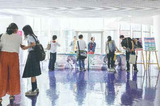 資料コーナーでは学校案内や入試ガイド、過去の学生作品集を配布