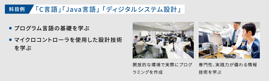 プログラミング技術に精通した情報エンジニアとして、必要なプログラミング言語、多様なプログラミング手法やアルゴリズムだけではなく、 ハードウェアに関する知識を修得します。