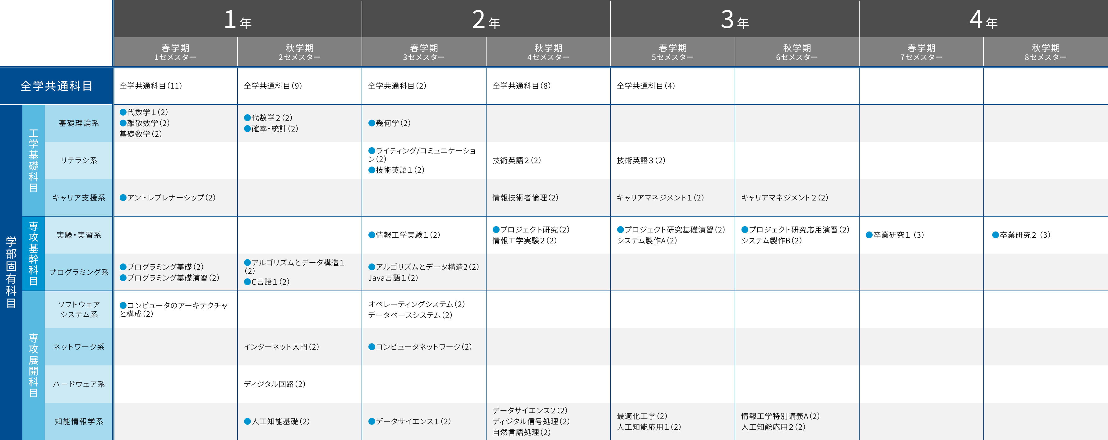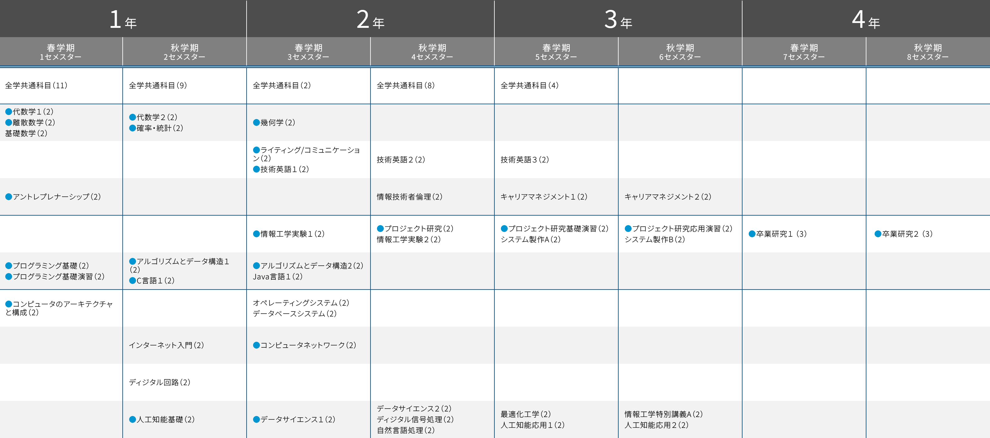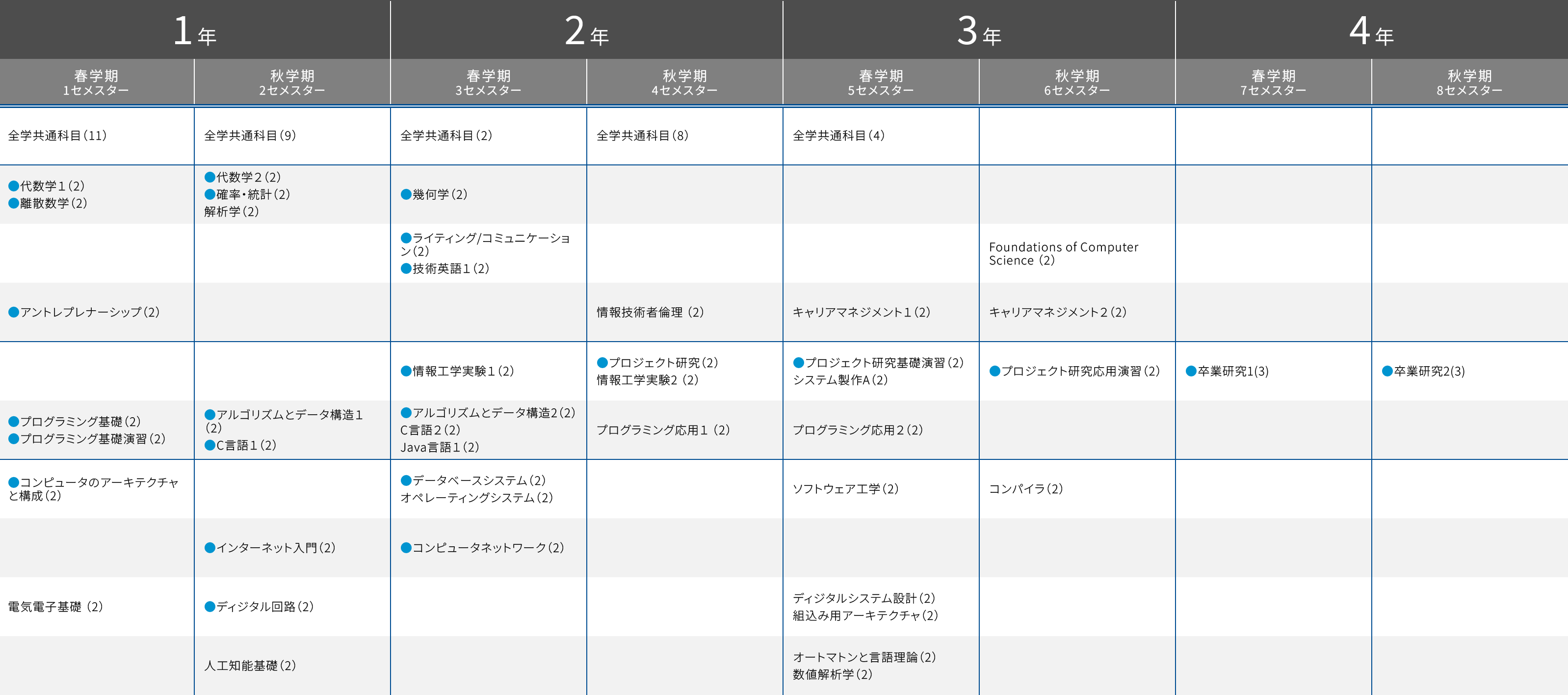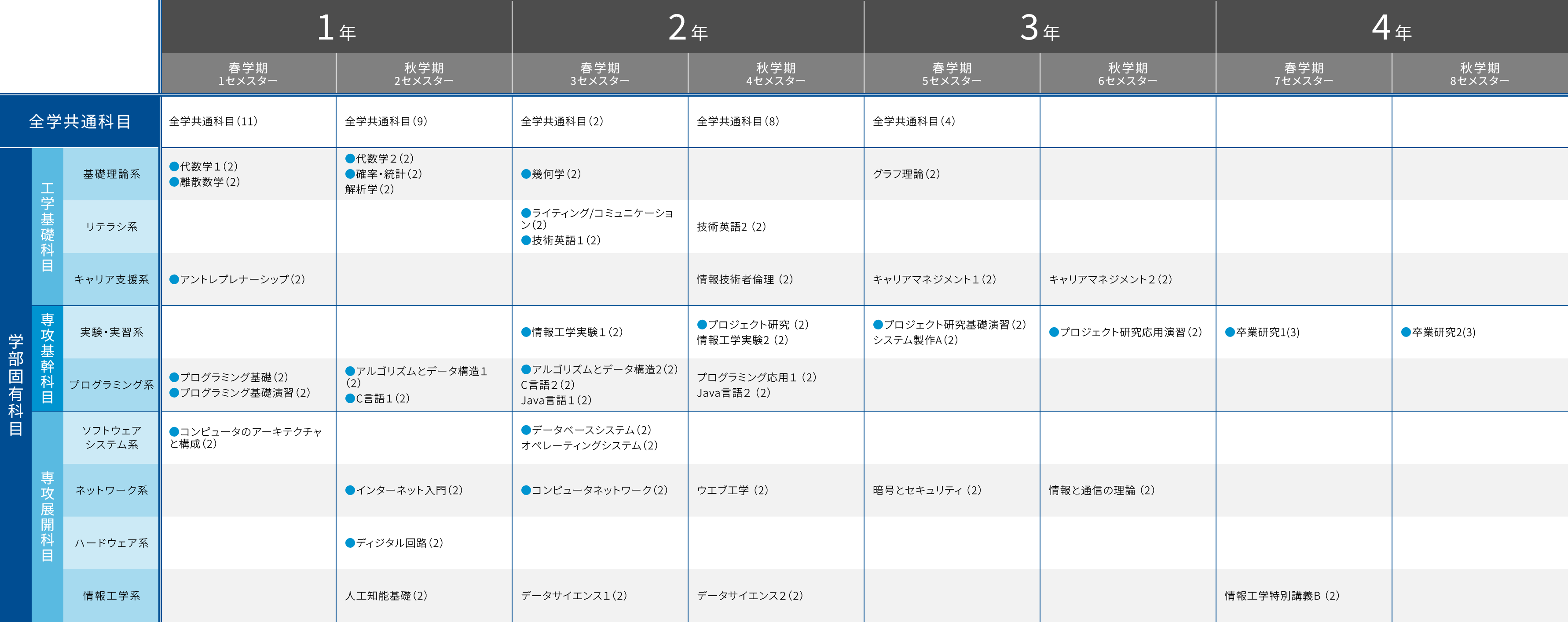 2027年度入学生より、情報工学科カリキュラムの変更を計画しています。なお、掲載の内容は予定であり、内容に変更が生じる場合があります。