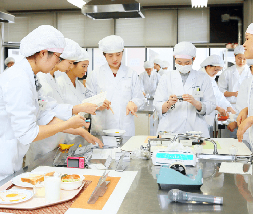 大量調理に適した給食経営管理実習室をはじめ、実習・実験教室が充実。 また、学内にある「京都女子大学栄養クリニック」は、 食と栄養に関する専門的な情報発信を行う研究所で、 多様な授業に食物栄養学科の学生も参加することができます。