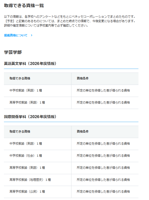 - 各大学の「就職・資格」ページにある「取得できる資格」に掲載されているのは、どのような資格ですか。