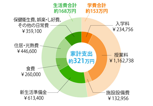 出典:学費は、文部科学省「令和5年度私立大学入学者に係る初年度学生納付金平均額調査」。私立大昼間部の理系学部の平均額。生活費のうち、新生活準備金(敷金・礼金、生活用品費)は、東京私大教連「私立大学新入生の家計負担調査(2023年度)」より引用。そのほかは、日本学生支援機構「令和4年度学生生活調査」の「居住形態別収入平均額及び学生生活費の内訳(大学昼間部)」より引用。