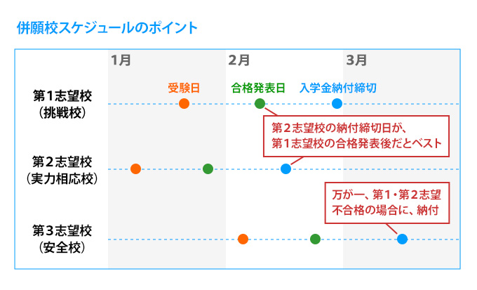 受験のスケジュールを組むときには、お金の面から考えると、試験日だけでなく合格発表日や入学手続締切日も考慮に入れることが重要です。