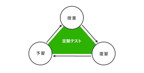 普段の勉強とは、すなわち「予習→授業→復習」というサイクルのこと。このサイクルがうまく定着すると、効率よく学習した知識を蓄積でき、定期テストで高得点がねらえるようになります。