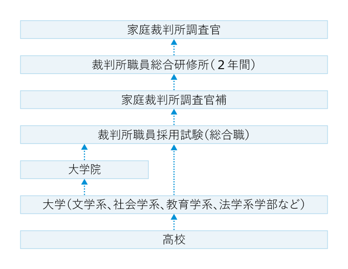採用後は、裁判所職員総合研修所で2年間研修を受け、修了後、各地の家庭裁判所に配属される。数年ごとに転勤を繰り返し、全国の家庭裁判所の本庁や主な支部の仕事を経験する。