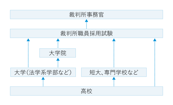 裁判所事務官になるためには、裁判所が行う裁判所職員採用試験(裁判所事務官)に合格しなければならない。総合職試験と一般職試験がある。