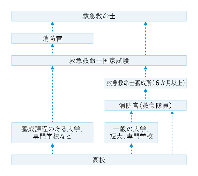 1つは、まず消防官として採用されてから国家試験を受験する方法。消防官として勤務しながら5年以上または2000時間以上の救急業務を経験し、さらに養成所で6か月以上の講習を受けることで受験資格が得られる。