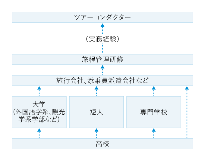 ツアーコンダクターになるためには、旅程管理主任者の資格を取得する必要がある。この資格は、観光庁長官の登録を受けた機関が実施する旅程管理研修を修了し、さらに一定の添乗の実務経験を積むと取得できる。資格を取得するためには、まずは旅行会社や添乗員派遣会社に所属することが第一歩と言える。