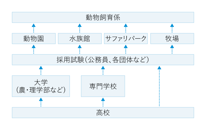 動物の飼育係やトレーナーになるために必要な資格や免許はない。しかし、動物の生態や飼育を理解するためには、大学などで動物生態学や畜産学を学んでおくと役に立つだろう。動物飼育の専攻を置く専門学校も多くある。