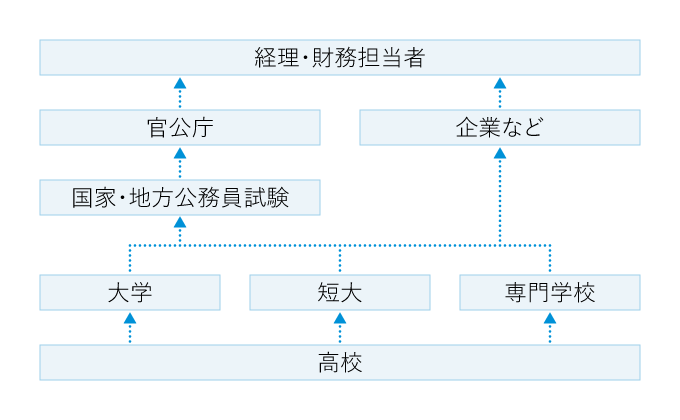 大手企業の経理担当者や財務関係のスタッフをめざすなら、大学の経営学・商学系、経済学系学部などで会計学、経営学を学んだり、大学院に進学するといいだろう。簿記資格は必須ではないが、取っておくと役に立つ。主な簿記資格には、日本商工会議所が行う簿記検定(日商簿記)と全国経理教育協会が行う簿記能力検定がある。