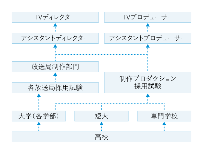 入社後はアシスタントからスタートし、ディレクターやプロデューサーに昇格するのが一般的である。