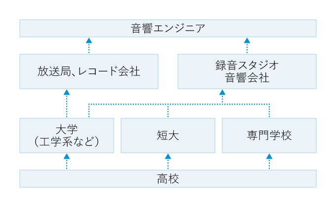 音響エンジニアになるのに必要な資格はないが、国家資格の「舞台機構調整技能士」や(一社)日本音楽スタジオ協会(JAPRS)の「サウンドレコーディング技術認定試験」を受験し取得することによりスキルアップが可能だ。また技術職なので、大学の工学系学部の電子工学科、情報通信工学科や、専門学校の養成課程などで音響関係の基礎技術を学び、音響関連の会社に入社するのが一般的なコースだ。