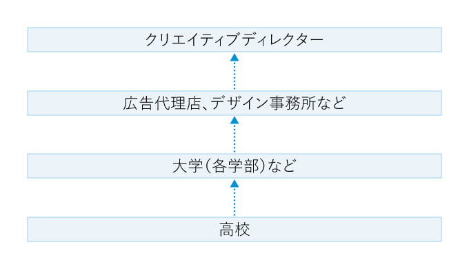 通常広告代理店などに入社後、コピーライターやCMプランナーの仕事で経験を積んだあと、クリエイティブディレクターになる。